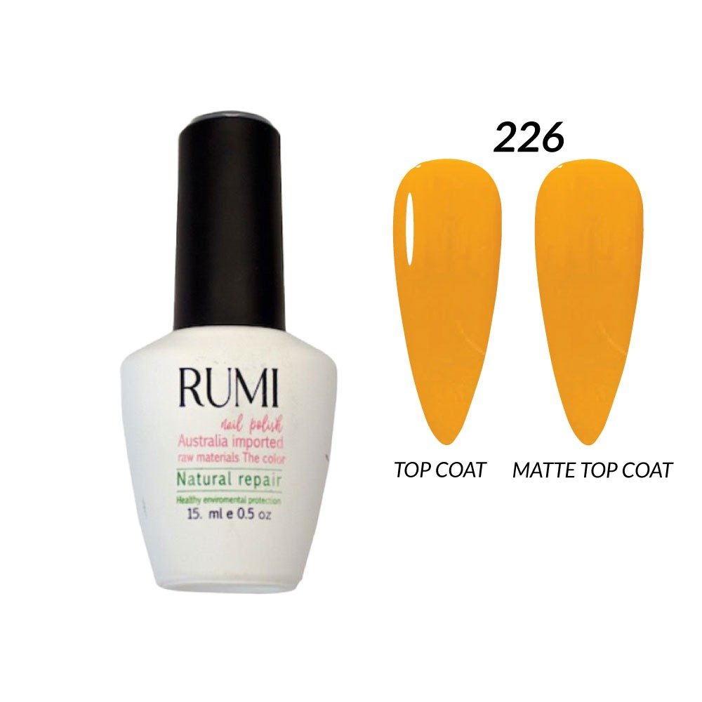 Esmalte semipermanente de la marca Rumi en presentación de 10 ml y código R226, formulado para manicure y pedicure con sistema de curado UV o LED. Este gel polish permite obtener cobertura homogénea y color definido cuando se aplica en capas finas sobre base coat y se sella con top coat, logrando un acabado brillante y profesional en uñas.